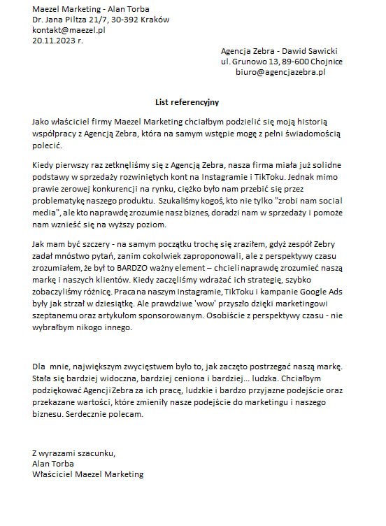 “ Chciałbym podziękować Agencji Zebra za ich pracę, ludzkie i bardzo przyjazne podejście oraz przekazane wartości, które zmieniły nasze podejście do marketingu i naszego biznesu. Serdecznie polecam.”